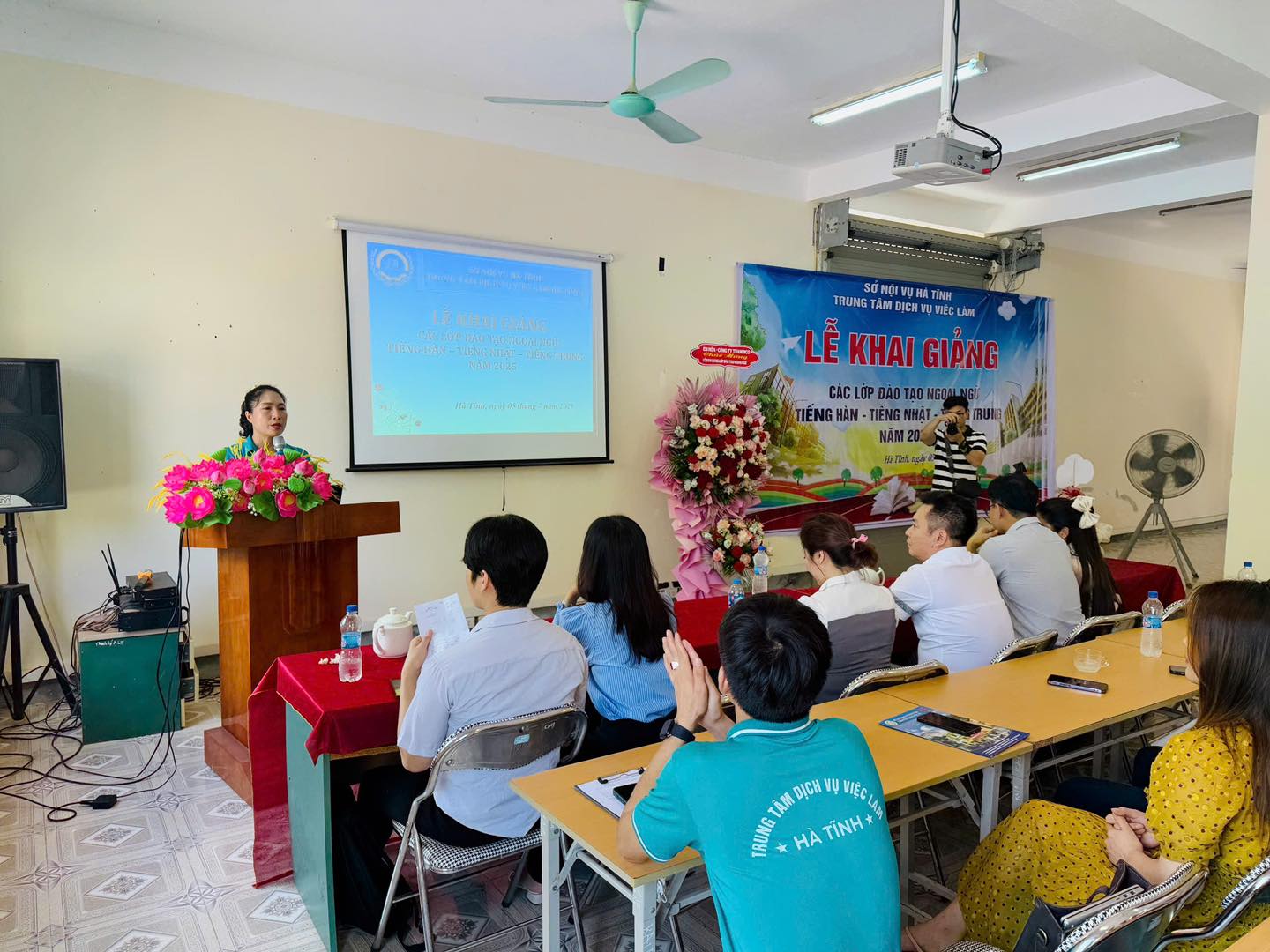 Bà Nguyễn Thị Thanh Hương – Giám đốc Trung tâm Dịch vụ Việc làm Hà Tĩnh Thầy Kim Min Jo – Trường Đại học Gimcheon, Hàn Quốc Thầy Hoàng Chí Viễn – Trưởng ban quốc tế, Đại học Công nghệ Triều Dương – Đài Loan Và hơn 60 học viên là người lao động và học sinh THPT trên địa bàn