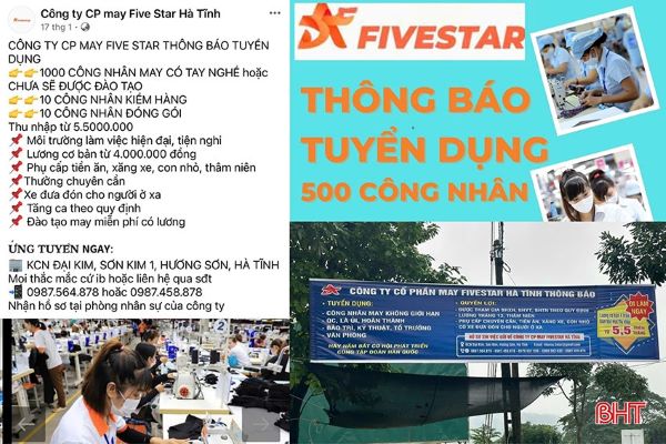 Để tập trung cho công tác tuyển dụng lao động, hiện nay Công ty CP May Five Star Hà Tĩnh đang triển khai bằng nhiều hình thức: tuyên truyền, tư vấn trực tiếp cho người dân, lao động địa phương; gọi điện trực tiếp cho số công nhân đã từng làm việc tại công ty; đăng tải trên các phương tiện thông tin đại chúng; treo băng rôn, phát tờ rơi...