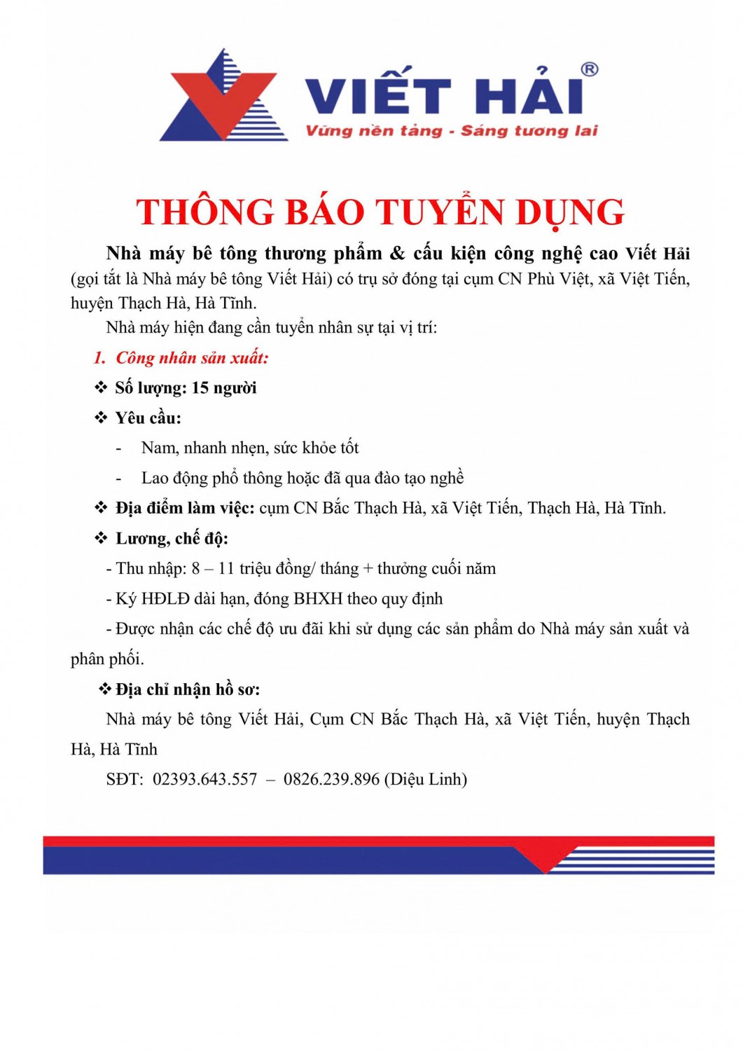👉 Đừng bỏ lỡ cơ hội gia nhập Nhà máy bê tông thương phẩm & cấu kiện công nghệ cao Viết Hải, nơi đặt nền móng cho tương lai của bạn!